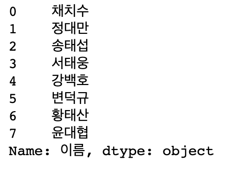 '이름' : ['채치수', '정대만','송태섭','서태웅','강백호','변덕규','황태산','윤대협'],