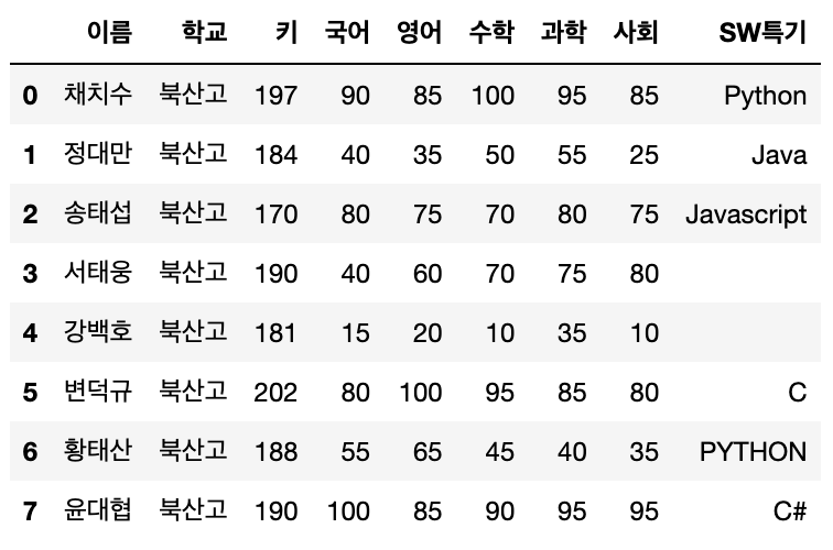 'SW특기': ['Python', 'Java', 'Javascript', '', '', 'C', 'PYTHON', 'C#']}