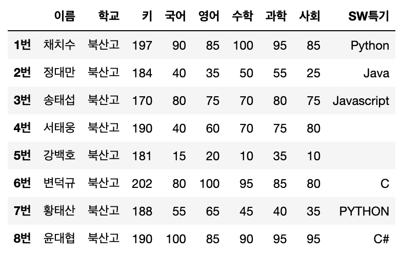 df = pd.DataFrame(data, index = ['1번','2번','3번','4번','5번','6번','7번','8번'])