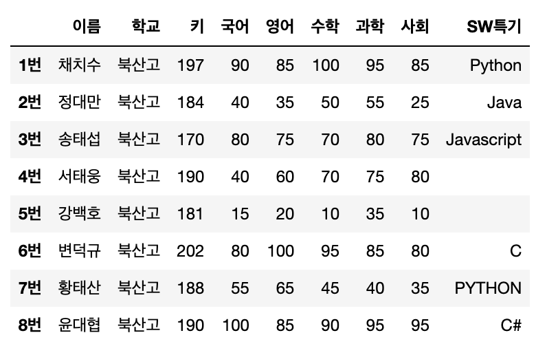 df = pd.DataFrame(data, index=['1번','2번','3번','4번','5번','6번','7번','8번'])