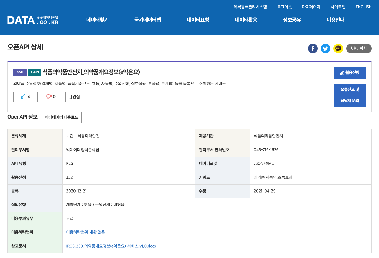 공공데이터포털 소개 공공데이터포털은 각 공공기관에서 수집한 공공데이터를 공개하여 개인이나 기업이 사용할 수 있도록 만든 페이지입니다. 공공데이터포털은 공공기관이 생성 또는 취득하여 관리하고 있는 공공데이터를 한 곳에서 제공하는 통합 창구입니다. 포털에서는 국민이 쉽고편리하게 공공 데이터를 이용할 수 있도록 파일데이터, 오픈API, 시각화 등 다양한 방식으로 제공하고 있으며, 누구라도 쉽고 편리한 검색을 통해 원하는 공공데이터를 빠르고 정확하게 찾을 수 있습니다. 출처 : 공공데이터포털 예를 들어 버스 도착 정보, 동네 날씨 정보 등이 공공데이터에 속하며, 이를 활용할 수 있도록 공개하고 있습니다. 이 정보 중 식품의약품안전처에서 공개한 의약품개요정보 API를 활용하는 방법에 대해 소개하고자 합니다. 우선..